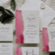 A borda esquerda deste elegante convite de casamento moderno apresenta uma coloração d'água rosa, borda agitada, aparada com falso brilho dourado. O texto personalizável combina manuscrito, copperplate e fontes itálicas em cinzas de carvão em um fundo branco. O verso fornece espaço para detalhes do casamento em um fundo branco sólido, junto com um código QR que os convidados podem digitalizar para visitar seu site e RSVP, o que economiza o custo de imprimir e enviar cartões RSVP separados.
