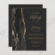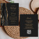Economize o custo de imprimir e enviar cartões RSVP separados com este elegante convite de casamento de orçamento integral. A borda esquerda apresenta uma borda preta de aquarelas, aparada com brilho dourado. O texto personalizável combina manuscrito dourado, fontes em copperplate e itálico em um fundo preto de slate. O verso fornece espaço para detalhes do casamento em um fundo preto de ardósias sólidas, junto com um código QR que os convidados podem digitalizar para visitar seu site e RSVP.