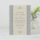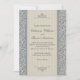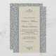 Um convite de casamento belamente elegante com uma cor damasco barroca azul e bege sobreposta com um conjunto coordenador de duas faixas bege. Correspondência de cor de texto azul completa o design. Todo o texto relativo a este convite pode ser editado à sua redação desejada.