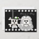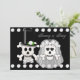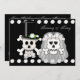 Convites de casamento de crânio e ossos cruzados. Crânios noivos e noivos e ossos cruzados com a fronteira do craveiro na frente e informações da cerimônia lá atrás. Imagem frontal parcialmente transparente também repetida no verso. Véu branco e arco branco para vestir o crânio; o crânio do noivo vestindo o chapéu superior e a gravata do arco. modelos de texto personalizáveis permitem inserir suas próprias informações.