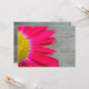 Um convite de casamento divertido e vibrante com uma foto de uma margarida rosa quente espreitando do lado esquerdo sobre um fundo de madeira. O lado oposto apresenta fundo de madeira de barro com texto no centro dentro um retângulo branco esboçado em rosa quente que corresponde à margarida. Personalize com detalhes da sua ocasião. A redação é de noiva e noivo.