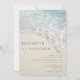 Perfeito para casamentos de destino, este convite de casamento de praia de verão moderno mostra uma foto de perto de uma praia com uma onda oceânica e um mar.