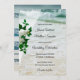 Um belo convite de casamento com flores de orquídea em um véu de casamento, olhando para uma praia com rendas românticas e pérolas. O local no verso é opcional. Este convite tem uma placa RSVP correspondente. Bonito para um casamento de praia ou destino.