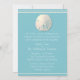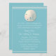 Adorável convite de casamento sobre o tema da praia feito em azul-turquesa, com gráficos de um dólar de areia marfim, no topo e nas listras de marfim, no topo e no fundo. Personalize o texto branco para atender às suas necessidades. Produtos de casamento de Sand Dollar disponíveis.