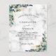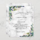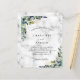 Impressão de mármore como fundo decorado com verde de eucalipto e folhagem de ouro. Personalize e adicione seus nomes e detalhes do casamento. Letras negras.