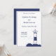 Convite de casamento elegante e simples com uma ilustração de um farol em tons azuis marinhos para um casamento de tema marinho e náutico!