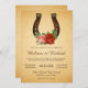 Incêndio aos seus convidados com este elegante convite de casamento, com uma bela ferradura vintage decorada com flores vintage contra um fundo de pergaminho rústico. Basta adicionar os detalhes do seu evento neste modelo fácil de usar para torná-lo um convite de tipo único.