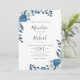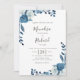 design do tema do casamento azul com flores azuis e brancas. O texto e as cores podem ser personalizados.