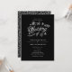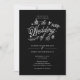 Design de convite de casamento da primavera com designs brancos e texto branco colorido em fundo preto.