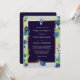 Este convite bonito de casamento apresenta bordas laterais de flores silvestres de cor aquosa e azul. Entre as flores encontram-se folhas verdes, grãos de ouro e laranja, e cabeças de sementes de coral e azul. No topo está um pequeno pássaro azul com uma flor azul no bico. No fundo está um pequeno buquê de flor silvestre. O seu texto é dourado claro no centro, e colocado numa seção azul escura que é moldada em ouro. A borda das flores, a imagem do pássaro e o buquê sobrepõem a estrutura dourada. Tudo é colocado sobre uma elegante cinza prateada. A parte de trás do convite é azul escuro consistente, e o pequeno buquê de flor selvagem é repetido no fundo. Elegante, moderno e apropriado para casamentos em qualquer estação!