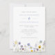 Um bonito convite para o casamento, em azul e amarelo, perfeito para um casamento na primavera, com flores silvestres e pansias em azul e amarelo, com folhas verdes, em fundo branco. Personalize com seus detalhes em azul e cinza.