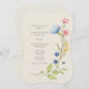 Convide seus hóspedes em estilo com este convite de casamento de flor silvestre branca apresentando florais românticos de cor d'água pastel em um cartão de borda curvada em forma única. Flores silvestres azuis, cor-de-rosa esbranquiçadas e amarelas criam uma estética botânica suave perfeita para casamentos de primavera e verão. Personalize a serif e a tipografia moderna do script, adicione seus detalhes pessoais e guie facilmente os convidados ao RSVP com o código QR integrado. Uma escolha encantadora para jardinagem, contrabando ou casamentos ao ar livre.
