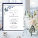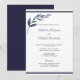 Um Marinho Elegante e um Convite para Casamento de Folha Floral Branca desenhado em fundo branco com bordas de marinho e floral de cor aquosa fluente suave. O texto inclui os nomes da noiva e do noivo, a data de casamento, o local e os detalhes de recepção. O inverso é um fundo clássico colorido do Marinho correspondente. Para personalizar, basta substituir o texto de exemplo usando nosso modelo fácil. Certifique-se de ver toda a Coleção de Casamentos de Folhas Florais e Marinhos Brancas para papelaria correspondente.