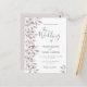 Um convite de casamento em rosa empoeirado e branco. Um fundo branco chic na frente. Decorados com prigos e folhagem de cor rosa botânica empoeirada. Escrita moderna e extensa, tipografia com o texto: O casamento de... Modelos para nomes e detalhes do casamento. Texto da cinza. Fundo: fundo de rosa poeirento leve.