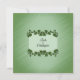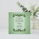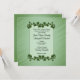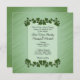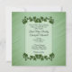 Um belo convite verde com fronteiras de folhas verdes. Coloque os primeiros nomes do casal de um lado com todas as informações do casamento e saudação da mãe e do pai da noiva. Por favor, verifique triplicamente todo o seu texto.