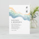 Convites de abstrato de verão com um simples fundo branco, um design de paleta de praia em aquarela, suas iniciais no canto superior direito, um modelo de texto elegante com seus nomes e os detalhes do casamento.