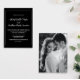 Clássico e sofisticado, este convite de casamento preto-e-branco apresenta sua foto favorita de um lado e seus detalhes de casamento do outro. O fundo preto eterno com uma elegante escrita branca torna este design perfeito para uma celebração formal ou negra de gravatas. Personalize facilmente com seus nomes, data de casamento e texto personalizado para corresponder ao seu estilo exclusivo.