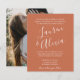 Convite para casamento de fotos de orçamento de script moderno - apresenta os nomes da noiva e do noivo, grandes e ousados na tipografia moderna de scripts. A parte de trás do convite mostra uma bela foto da noiva e do noivo. O convite fará parte de uma suíte de casamento e estará disponível em várias cores. Você pode mudar facilmente a cor de fundo para corresponder ao seu tema de casamento. Mostrado em teracotta. Um convite simples e clássico com caligrafia bonito. * Observe que esta é uma opção de orçamento. A foto será certamente de melhor qualidade no nosso convite. Se preferir um estoque de papel mais grosso e de melhor qualidade, por favor escolha nosso convite simples. Recomendamos NÃO escolher a opção satin para o convite orçamental. Projetada por Beverly Bainbridge Homespun Cottage Designs E: homespuncottagedesigns@gmail.com