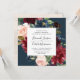 Nosso convite de casamento floral do Radiant Bloom em um formato quadrado único enquadra seus detalhes de casamento com flores pintadas de cor d'água em rosa-pincel, burgundy marsala e azul-marinho, com folhagem verde de eucalipto contra um rico fundo de marinho. Uma escolha moderna, porém orgânica, para o outono e casamentos no inverno com folhagem verde fresca, flores e anotações manuscritas.