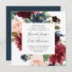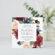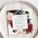 Nosso convite de casamento floral do Radiant Bloom em um formato quadrado único enquadra seus detalhes de casamento com flores pintadas de cor d'água em rosa-pincel, burgundy marsala e marinho azul, com folhagem verde de eucalipto. Uma escolha moderna, porém orgânica, para o outono e casamentos no inverno com folhagem verde fresca, flores e anotações manuscritas.