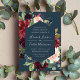 Nosso convite para o casamento do Radiant Bloom rodeia os detalhes do dia do seu casamento com um quadro geométrico de flores pintadas de cor d'água em burgundy marsala, cor-de-rosa e azul-marinho, com folhagem botânica verde e folhas de eucalipto num rico fundo azul-marinho. Uma bela escolha em cores exuberantes e saturadas para outono ou casamentos no inverno.