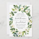 Nosso convite para o casamento de Alabastro rodeia seus detalhes do dia do casamento com um quadro oval de cor d'água pintada verde, folhagem botânica, rosa branca e flores de peônia.