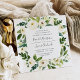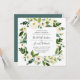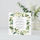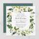 Nosso convite de casamento floral do Alabastro em um formato quadrado único enquadra seus detalhes de casamento com verde botânico de cor d'água pintado, rosa branca e flores de pénia. Uma escolha moderna, mas orgânica, para primavera, Verão ou casamentos no inverno com folhagem verde fresca, flores luxuosas e inscrições manuscritas.