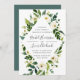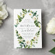 Nosso convite de casamento Alabastro enquadra seus detalhes de casamento com água pintada de verde e folhagem pintada com peões brancos e rosas. Uma escolha moderna, porém orgânica, em verde e branco, com botânicos esmagadores e letras escritas à mão.