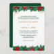 Este é um convite para o casamento elegante e bonito da Festa de Férias que apresenta o verde de Natal e a poinsettia vermelha floresce como uma fronteira de cima e de baixo. A fronteira de cima também tem bagas de ouro e um rolo embelezado para aumentar o interesse. Seu texto personalizado está em verde e ouro correspondentes no centro, e há muito espaço para mudanças. A parte de trás do convite é verde de Natal sólido.