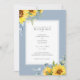 Um convite elegante, de girassol e de design de folhagem de eucalipto, com um tema de cor azul empoeirado. Pronto para personalizar com fontes de sua escolha ou sair conforme mostrado aqui e adicionar seus detalhes para seu dia especial.