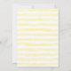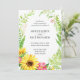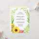 Convite para casamento de girassol com flores amarelas e cor-de-rosa e folhas verdes sobre fundo branco. As flores enquadram a formulação do convite. A parte de trás do convite tem um fundo listrado amarelo pálido.