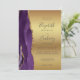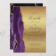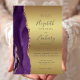 A borda esquerda deste elegante convite de casamento moderno apresenta uma cor d'água roxa, borda agitada, aparada com falso brilho dourado. O texto personalizável combina manuscritos, placas de impressão e fontes itálicas em cinzas de carvão em um fundo de folha de papel dourada. O verso apresenta um design de agate roxo e dourado correspondente.