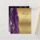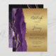 A borda esquerda deste elegante convite de casamento moderno apresenta uma cor d'água roxa, borda agitada, aparada com falso brilho dourado. O texto personalizável combina letra preta de ardósia, fonte em copperplate e itálico em fundo de folha de papel azul. O verso apresenta um design de agate roxo e dourado correspondente.