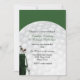Convite para casamento no templo de Golf, com gráficos de um padrão branco de uma bola de golfe de padrão branco servindo como área de texto, contra um fundo verde. Gráficos de uma bolsa de golfe verde, com tacos e uma bola de golfe em uma vara, decoram o canto inferior esquerdo. Personalize o texto personalizado de acordo com as necessidades do seu grupo de golfe. Placas RSVP correspondentes disponíveis.