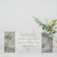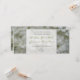 Um convite de casamento magro com um fundo de híbridos brancos na frente e atrás. Personalize o texto verde e cinza no centro com detalhes de sua ocasião. A redação é dos pais da noiva. Procure itens correspondentes na Paperie da Jill.