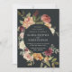 Os convites para casamentos florais ou outono ou casamentos no inverno apresentam os seus detalhes rodeados por rosas de aquarelas, mães e verde em cores rústicas do outono, incluindo pêssego, marfim, escamas, burgundy e verde sobre um fundo elegante fora de preto. Um design moderno e elegante para casamentos quentes rústicos nos meses de outono ou inverno.