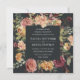Nosso convite para o casamento do Jardim da Lua em um formato quadrado único enquadra seus detalhes de casamento com rosas e mães pintadas de aquarela em tons de burgundy, marsala, cor-de-rosa-pincel e pêssego, com folhagem verde-escura e folhas. Uma escolha elegante para o outono ou casamentos no inverno, com flores exuberantes em um fundo fora do preto dramático.