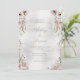 Um convite de casamento cor-de-rosa prateada e pincelada que apresenta pedras pintadas de aquarela e dahlias em cor-de-rosa-pincel e branco com verde contra um fundo prateado brilhante e quente com seus nomes em uma letra elegante e os detalhes em uma serifa san maiúscula.