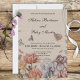 Este belo convite inspirado na vintagem é ilustrado com uma cena pacífica de jardim, cheia de borboletas coloridas. Este convite pode ser adquirido separadamente ou como parte de um pacote de cartões de casamento.