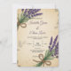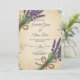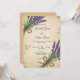 Um belo design de convite de casamento rústico, que apresenta imagens de lavanda moles, amarradas com fio natural em cantos opostos, acentuado com delicadas folhas de eucalipto e talheres de ouro gentis para um charme de vintagem. O fundo de pergaminho bege quente dá uma aparência elegante e eterno, com espaço para texto totalmente editável. Perfeito para casais planejando um casamento rústico, rural ou inspirado na natureza.