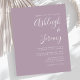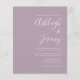 Este simples convite de casamento moderno apresenta um texto branco sobre um fundo poeirento de lavanda. Adicione os nomes da noiva e do noivo na caligrafia de escrita manual do na moda e os detalhes na fonte sans serif. O lado inverso é uma sombra correspondente de lavandas poeirentas sólidas.
