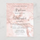Um design moderno, chic, com um elegante fundo de mármore, aparado com brilho falso em tons de ouro rosa, cor-de-rosa e branco. Os nomes da noiva e do noivo aparecem no script de cinza de carvão, com o texto restante na fonte sans serif. O mármore e o design de brilho repetem-se ao contrário.