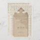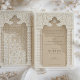Este maravilhoso convite para o casamento desenhar inspiração da rica tradição da arquitetura islâmica, mostrando um design de arco palatial, elegantemente flanqueado por colunas com padrão Chevron em uma paleta matizada de creme, taupe e ecru. O intricado detalhamento em forma de rendas no alto da arca, rendido em tons de areia e marfim, acrescenta uma camada de sofisticação, invocando a beleza eterno de intrincada obra plástica encontrada em mesquitas históricas. Este convite é o epítome da elegância e da herança, estendendo um convite gracioso para seus convidados com sua mistura de arte cultural e elementos modernos de design, estabelecendo a palco de um casamento que celebra o amor e a tradição.