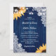 Convite para casamento de Elegante marinho azul e girassol com girassóis e rendas florais rústicas em um fundo de madeira de celeiro. Design de cartão perfeito para convidar seus hóspedes para sua festa de casamento da Rústica Azul marinho inspirada pelos girassóis.