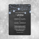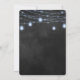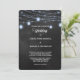 Este bonito convite de casamento é perfeito para uma cerimônia de noites ou crepúsculo. Ele apresenta cordas de potes azuis brilhantes e luzes de mason no topo, tanto na frente quanto atrás. As cordas das luzes brilham contra um fundo no estilo do quadro negro. Abaixo das luzes está seu texto personalizado em branco. Simples, mas elegante, e lindo para casamentos em qualquer estação.