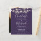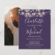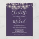 Apresentando luzes de string bonito e nomes de estilo de assinatura. Este elegante convite de casamento roxo pode ser personalizado com seus detalhes de casamento em carta chic e foto especial no verso. Projetado por Thisnotme©