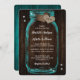 Convite de casamento teal russo com um jarro de pedras e corações de burlap em um fundo de madeira.