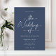 Este sofisticado convite para casamento de marinhos apresenta um design de roteiro elegante com uma fonte moderna de caligrafia. O fundo do marinho cria uma aparência eterno e elegante, perfeita para um casamento romântico e na moda. Personalize-o com seus detalhes para um toque perfeitamente personalizado. Ideal para temas de casamento formais, clássicos e contemporâneos.