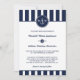 Convite náutico de pré-disquete com uma âncora bonita moderna, faixas marinho azuis e brancas, e espaço para as primeiras iniciais da noiva e do noivo no topo do convite.