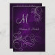 Este é um convite de casamento na moda, rico e bonito com a noiva e o primeiro nome do noivo e monograma em cinzas prateadas num elegante gradiente roxo real. As espirais bonito de prata terminam na frente do convite. As costas prendem o texto do seu casamento em cinzas prateadas no mesmo fundo roxo. Muito bonito para casamentos de inverno ou outono, especialmente, mas na moda para qualquer estação. *Também projetamos uma versão deste convite com texto moderno atualizado, que vocês podem ver em nossa coleção "Casamento Roxo", ou em nossa loja.